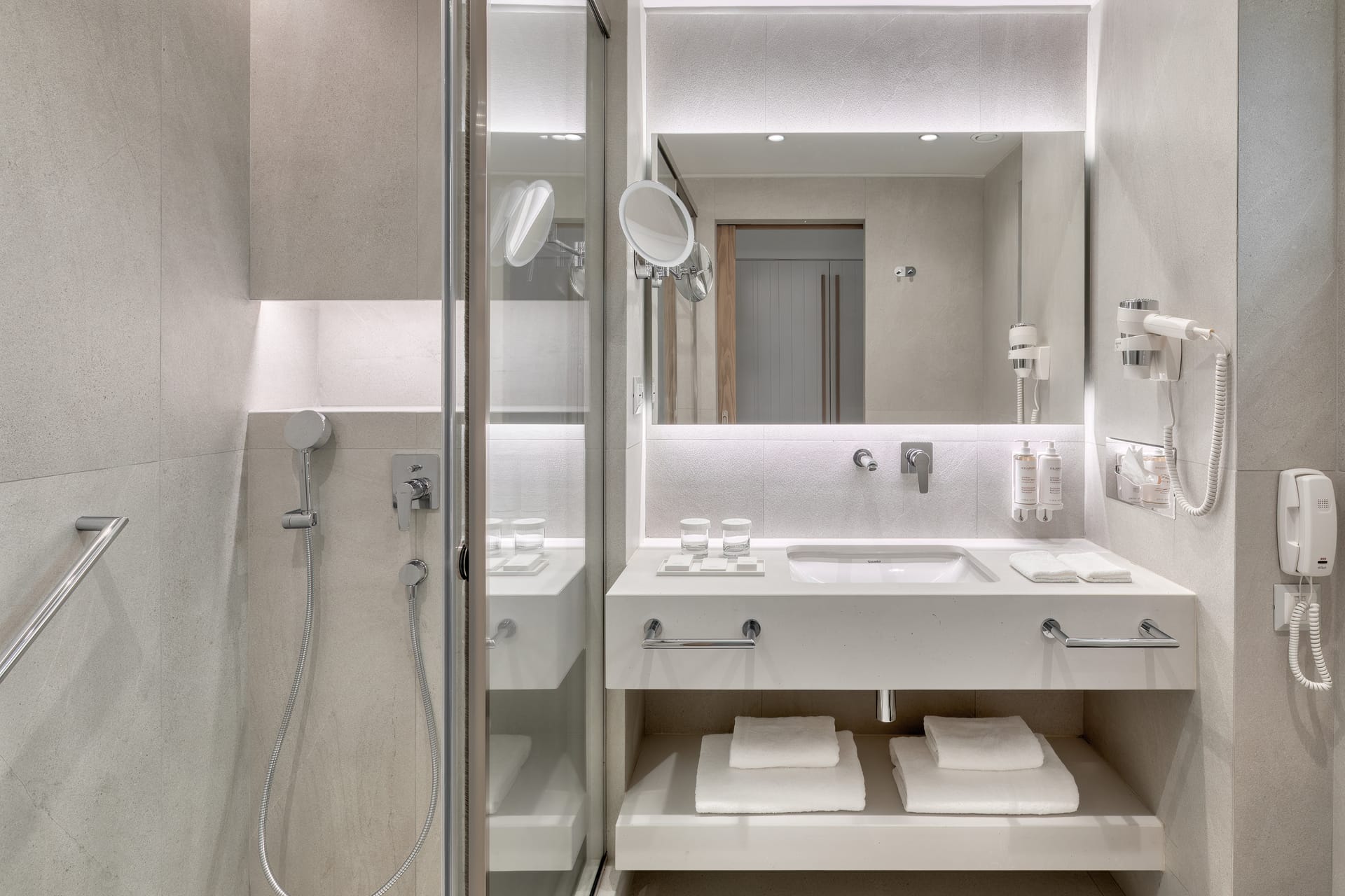 As beautiful as it is relaxing, the space is dressed in cool whites and taupes, with concealed lighting, wooden details, and furnishings adding character and class. Similarly, the latest smart hotel technology solutions ensure that guests’ experience is on par with the highest international standards. At the same time, the ultra-sophisticated bathrooms with walk-in rain showers lend a suitably pampering touch.